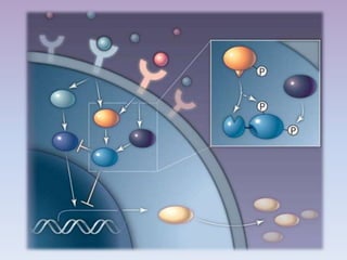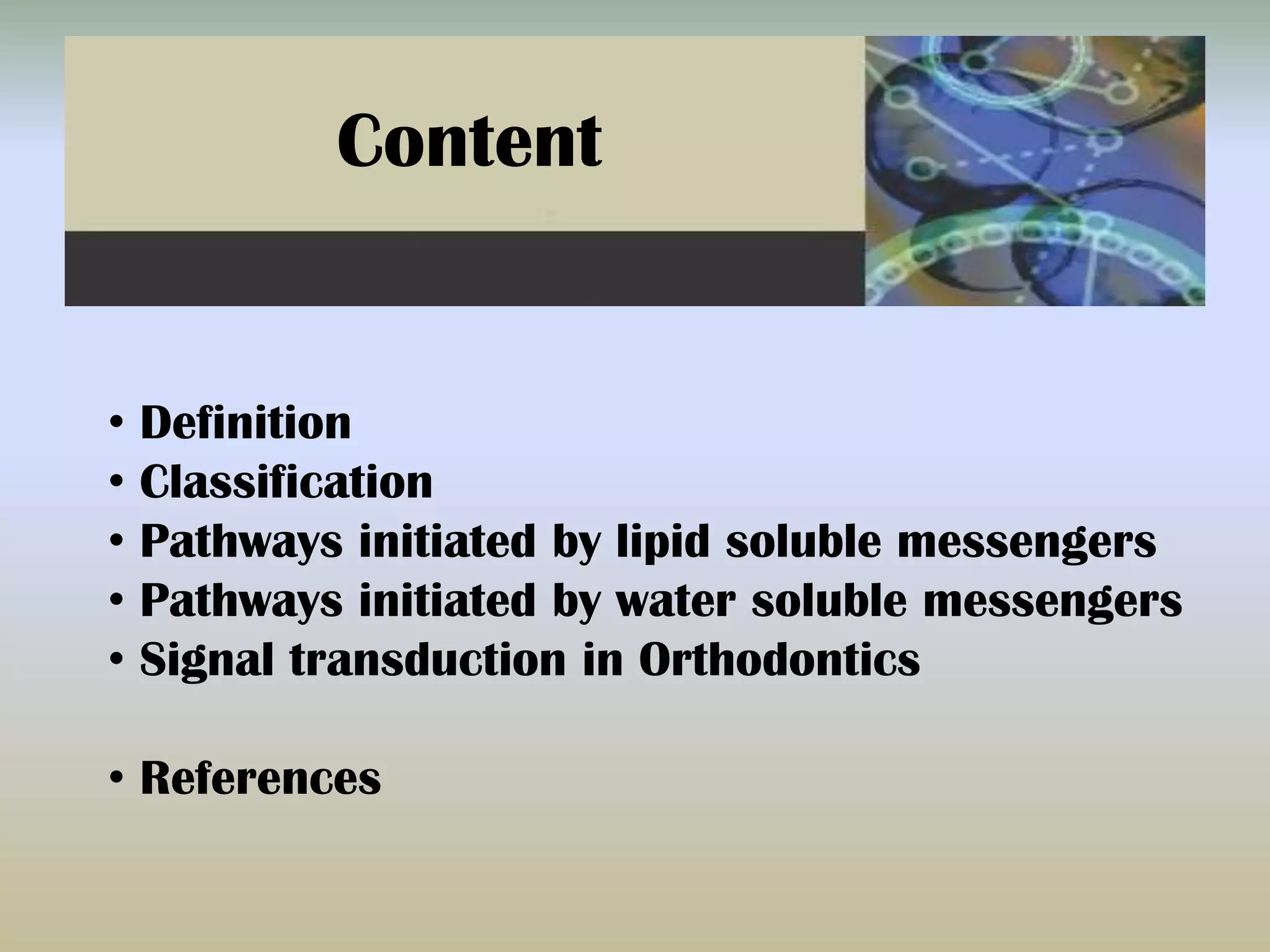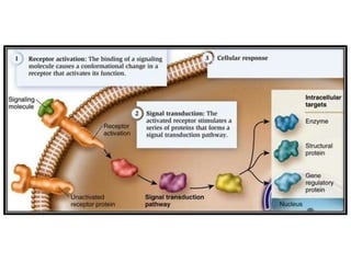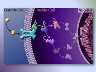 Cell signaling pathways allow communication between cells through the use of intracellular and extracellular messengers. They are broadly classified as pathways initiated by lipid-soluble messengers, like steroid hormones, or water-soluble messengers, like most hormones and neurotransmitters. The pathways involve messenger binding to receptors which then activates intracellular proteins, resulting in changes in gene transcription, ion channels, or enzymatic activity. This leads to cellular responses like changes in metabolism, secretory activity, or proliferation. In orthodontics, these pathways govern processes like osteoblast differentiation during bone formation and osteoclast recruitment during bone resorption in response to mechanical forces.