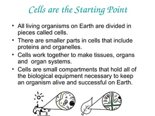 Plant and animal cells contain organelles that carry out essential functions. Key organelles include the nucleus, which controls cell activities, mitochondria which generate energy, and the cell membrane which regulates what enters and exits the cell. Plant cells additionally contain a cell wall, chloroplasts for photosynthesis, and larger vacuoles for storage. While organelles vary in shape and function, they work together within cells to keep organisms alive.