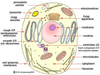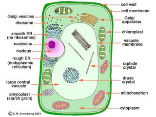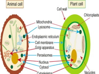 Plant and animal cells share some common structures but also have distinct differences. Both contain organelles like the nucleus, mitochondria, endoplasmic reticulum, Golgi bodies, lysosomes, and cytoplasm that carry out basic cell functions. Plant cells additionally contain a cell wall, chloroplasts, and central vacuole not found in animal cells. The nucleus acts as the cell's control center while mitochondria generate energy and chloroplasts carry out photosynthesis in plant cells. Cell membranes envelop cells and regulate what enters and exits through selective permeability.