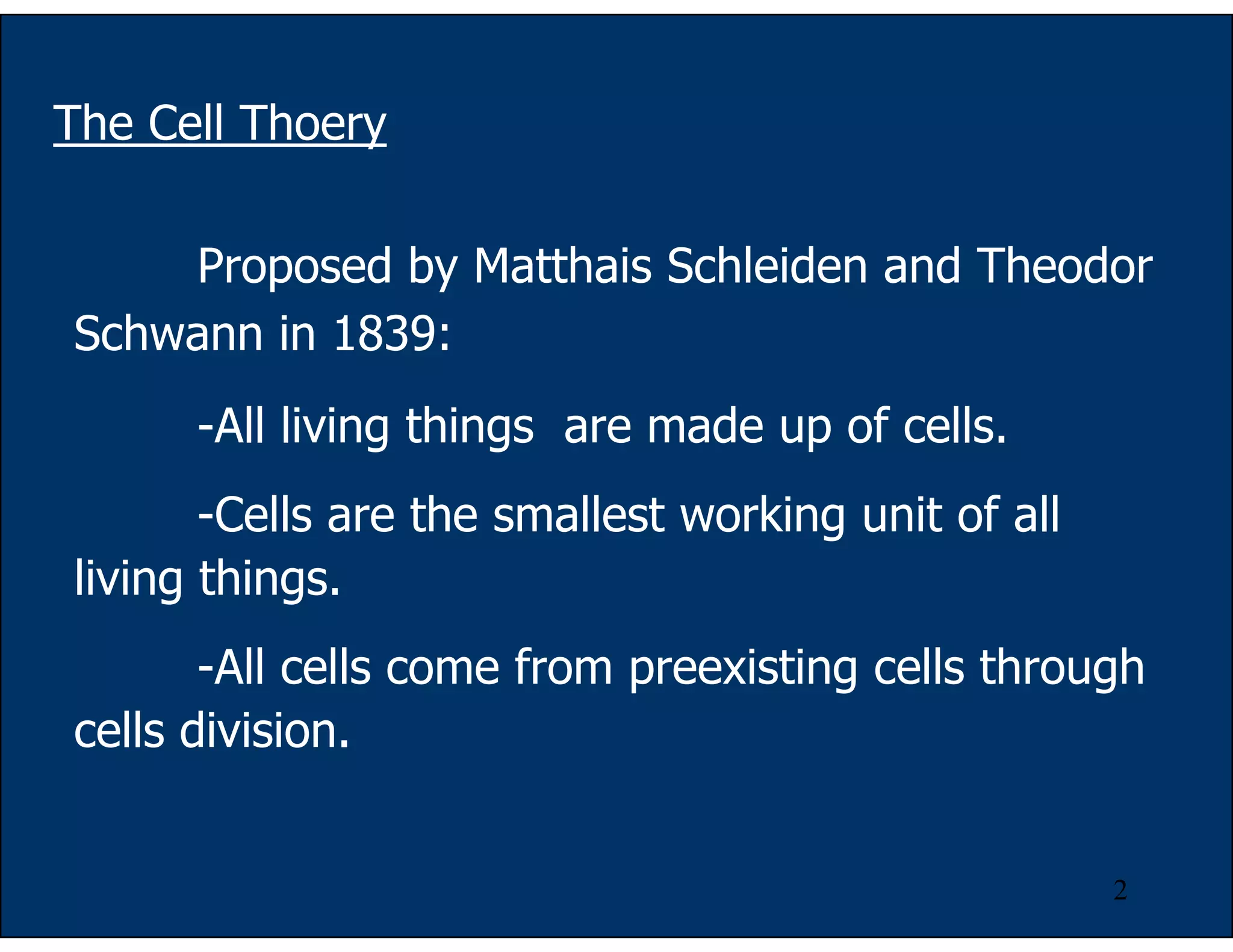 The document summarizes key aspects of cell structure and function. It describes the development of cell theory and microscopy techniques used to study cells. The main components of cells are discussed, including the plasma membrane, nucleus, ribosomes, endomembrane system of organelles like the ER, Golgi apparatus and lysosomes. Cell fractionation techniques are also summarized as a way to separate organelle components for further study.