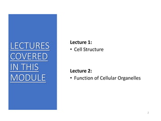This document outlines the structure and function of cells, covering molecular cell biology, the principles of cell theory, and the significance of understanding cell biology in relation to diseases. It emphasizes that all diseases are caused at the cellular level and highlights various examples, such as cancer and cystic fibrosis, alongside the basics of cellular composition and the differences between eukaryotic and prokaryotic cells. Additionally, it explains the functions of different cell types and organelles, the importance of cell communication, and the role of the cytoskeleton in maintaining cell structure and function.