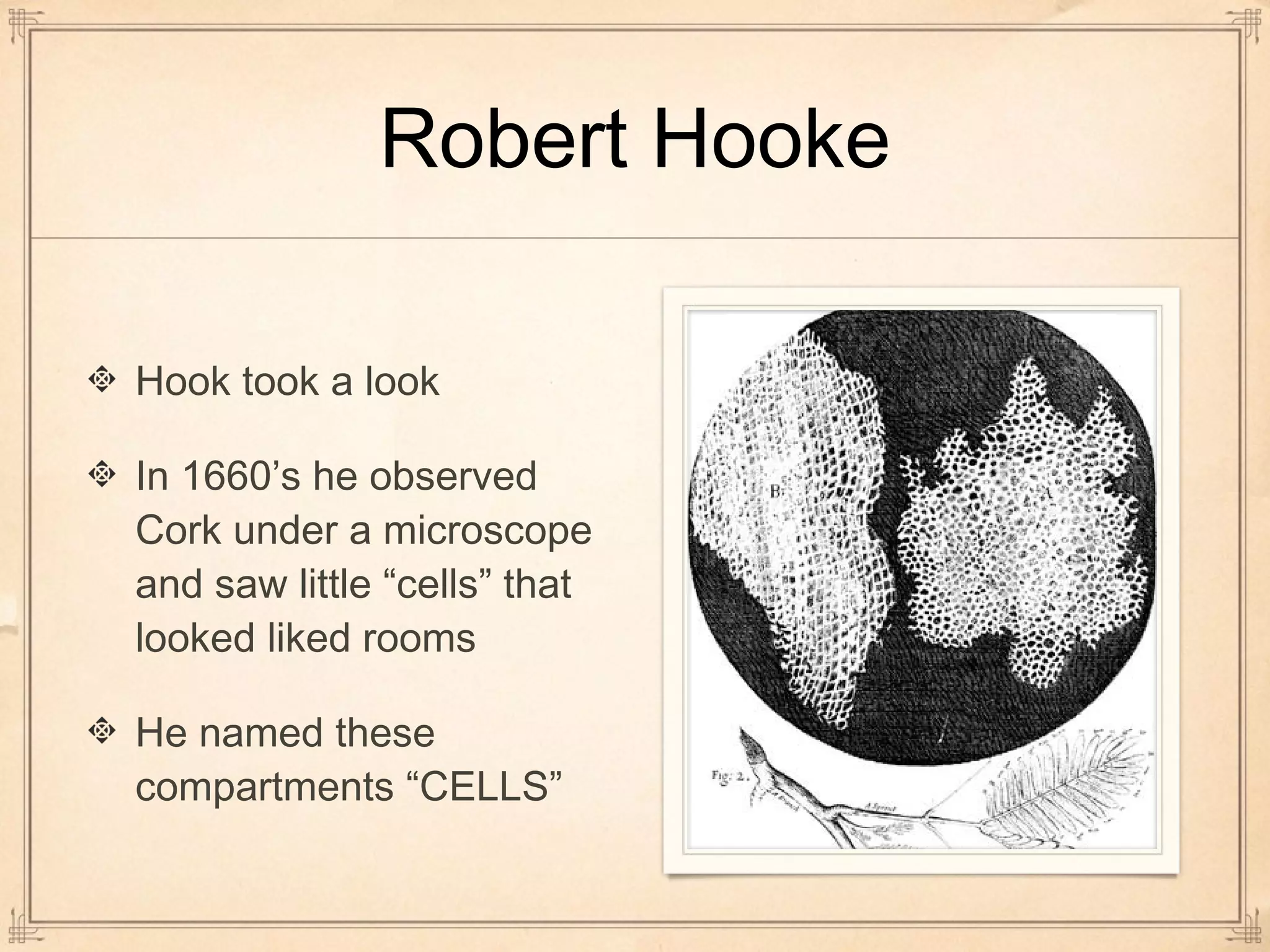 - In the 1600s, Robert Hooke observed "cells" under a microscope when examining cork and coined the term. Anton van Leeuwenhoek then described living cells from pond water in the 1670s.