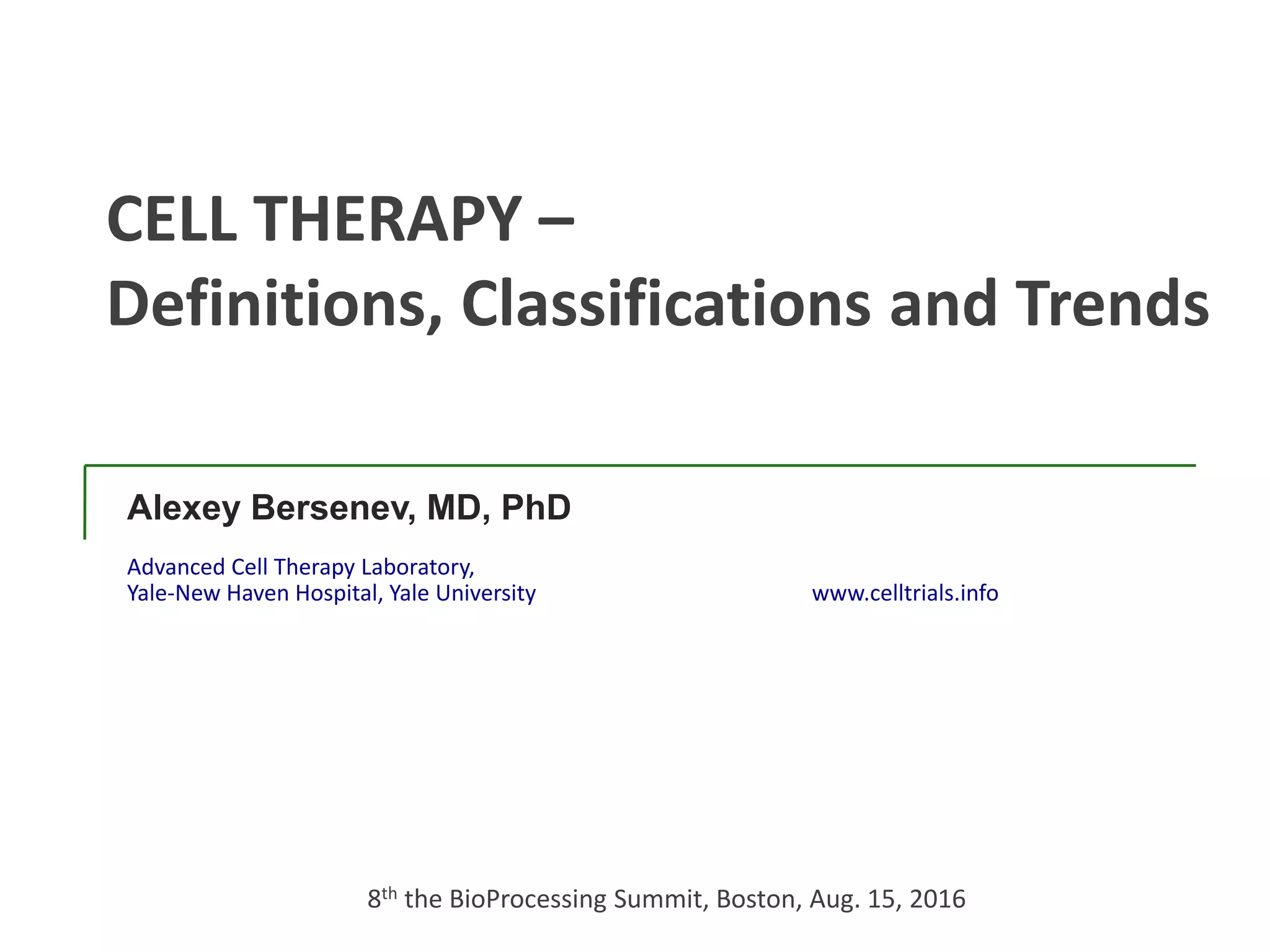 This document discusses definitions, classifications, and trends related to cell therapy. It defines cell therapy as the administration of cells to the body for therapeutic purposes and regenerative medicine as replacing or regenerating tissues to restore function. Classifications of cell therapies include immunocellular vs regenerative approaches and autologous vs allogeneic cell sources. The trends show growing interest in immunocellular therapies and use of mesenchymal stem cells and adipose tissue-derived cells. Regulatory classifications of cell therapies vary between countries and agencies and certain cell therapies can be difficult to clearly define, creating potential confusion.