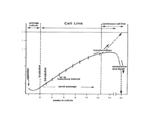 Cell culture involves growing cells under controlled conditions outside of their natural environment. A cell line is a permanently established cell culture that will proliferate indefinitely. Primary cell cultures have a finite lifespan before senescence, while continuous cell lines are immortalized, aneuploid, and tumorigenic. When selecting a cell line, factors like species, growth characteristics, stability, and phenotypic expression should be considered depending on the experimental purpose. Common cell lines are derived from tissues like liver, kidney, lung, and ovary and are used for applications such as drug screening, bioassays, and production of vaccines and therapeutic proteins.
