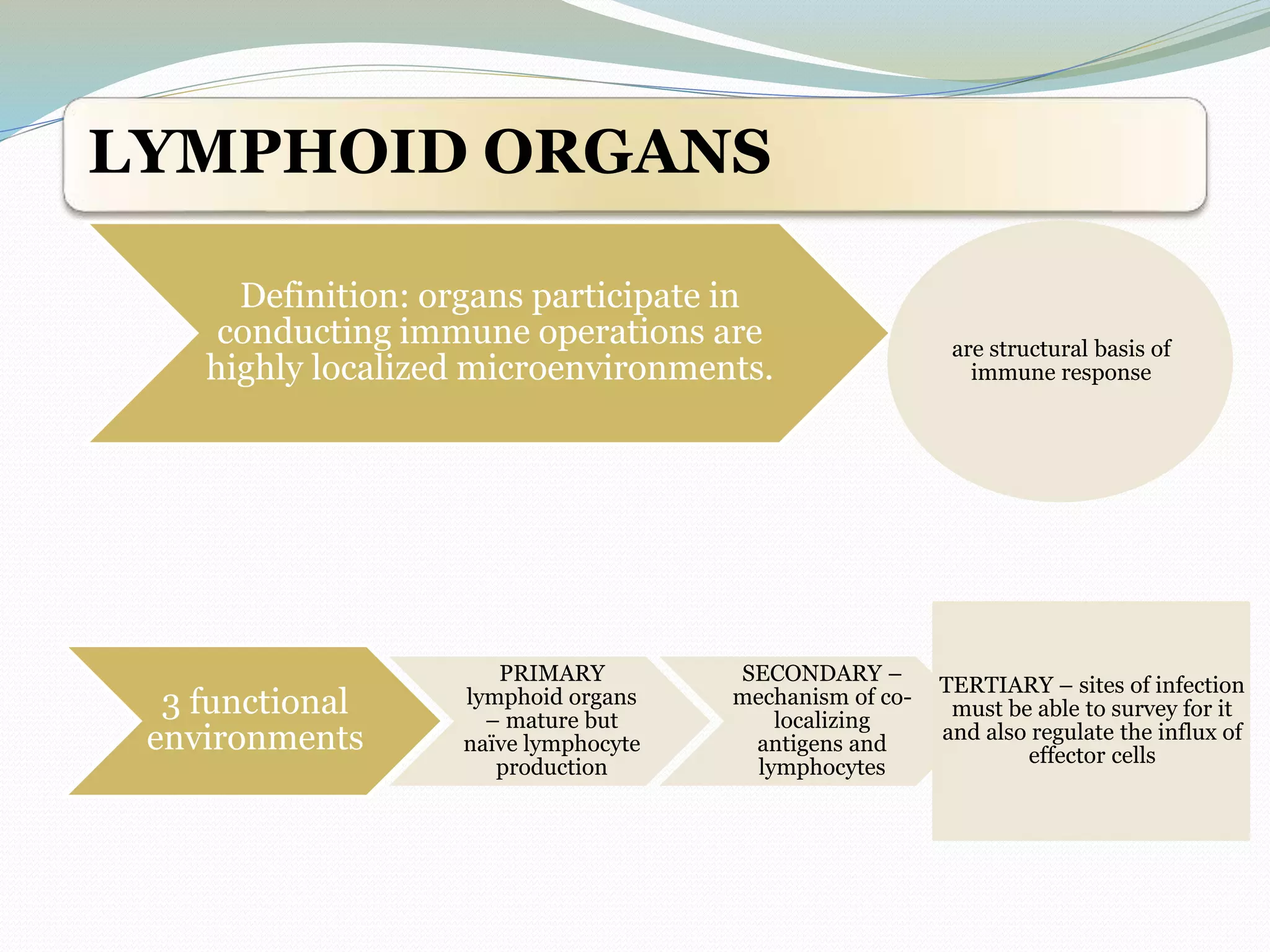 Lymphoid organs such as the bone marrow, thymus, lymph nodes, and spleen are involved in conducting immune responses. The bone marrow and thymus are primary lymphoid organs that produce naïve lymphocytes. Secondary lymphoid organs such as lymph nodes and the spleen facilitate interactions between antigens and lymphocytes. Tertiary lymphoid organs are sites of infection that immune cells must survey and regulate the influx of effector cells to. The document then discusses the cells and processes involved in the primary and secondary lymphoid organs.