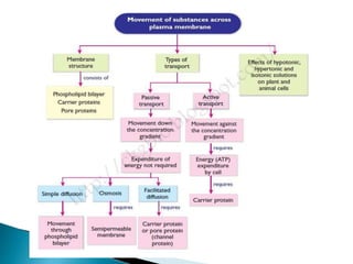 This document provides an overview of cell membranes and various types of cellular transport. It discusses the structure of the cell membrane and its selectively permeable properties. It describes passive transport mechanisms, including simple diffusion, facilitated diffusion, and osmosis. It also explains active transport, distinguishing between primary active transport which uses ATP hydrolysis, and secondary active transport which utilizes concentration gradients. Vesicular transport processes of exocytosis and endocytosis are also outlined. Examples of abnormalities in transport proteins like sodium-potassium pumps are given. Key references consulted are listed.