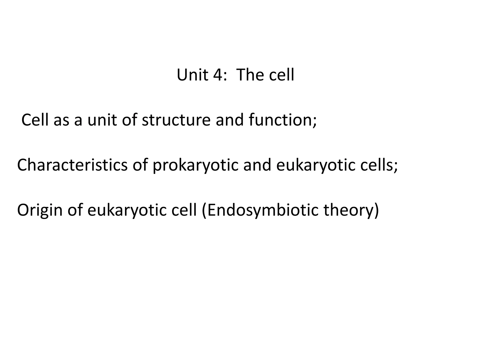 The document discusses the structure and function of cells, distinguishing between prokaryotic and eukaryotic cells and introducing the endosymbiotic theory that explains the origin of eukaryotic cells. It highlights key cell components, functions, and the historical development of cell theory from early observations by scientists like Robert Hooke and Lynn Margulis. Additionally, it provides details about cell size, organization, and the importance of various organelles in cellular processes.