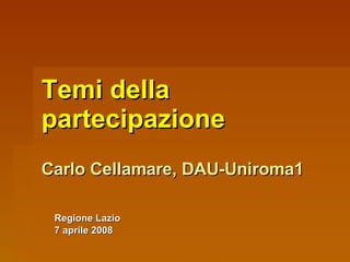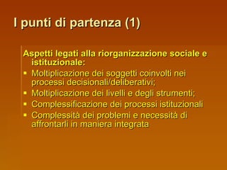 Il documento esplora i temi della partecipazione nella governance moderna, sottolineando la necessità di integrare processi decisionali e coinvolgere i cittadini in vari aspetti della pianificazione urbana e dello sviluppo locale. Viene discussa la complessità dei processi istituzionali e il passaggio da logiche gerarchiche a pratiche collaborative, evidenziando l'importanza della concertazione e della trasparenza. Le sfide legate alla democrazia rappresentativa e la crisi della politica richiedono un coinvolgimento attivo e diffuso dei cittadini nelle decisioni pubbliche.