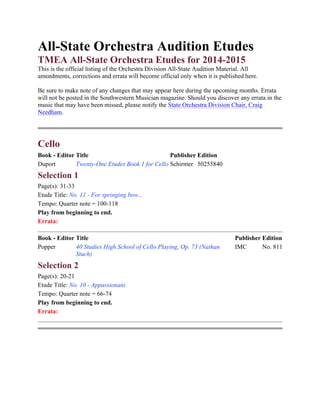 This document provides the official listing of etudes for the 2014-2015 All-State Orchestra auditions for cello. It lists the required etudes, including the book title, editor, publisher, edition, page numbers, etude title, tempo, and any known errata. Musicians should check this document for any updates or corrections to the audition materials throughout the upcoming months.