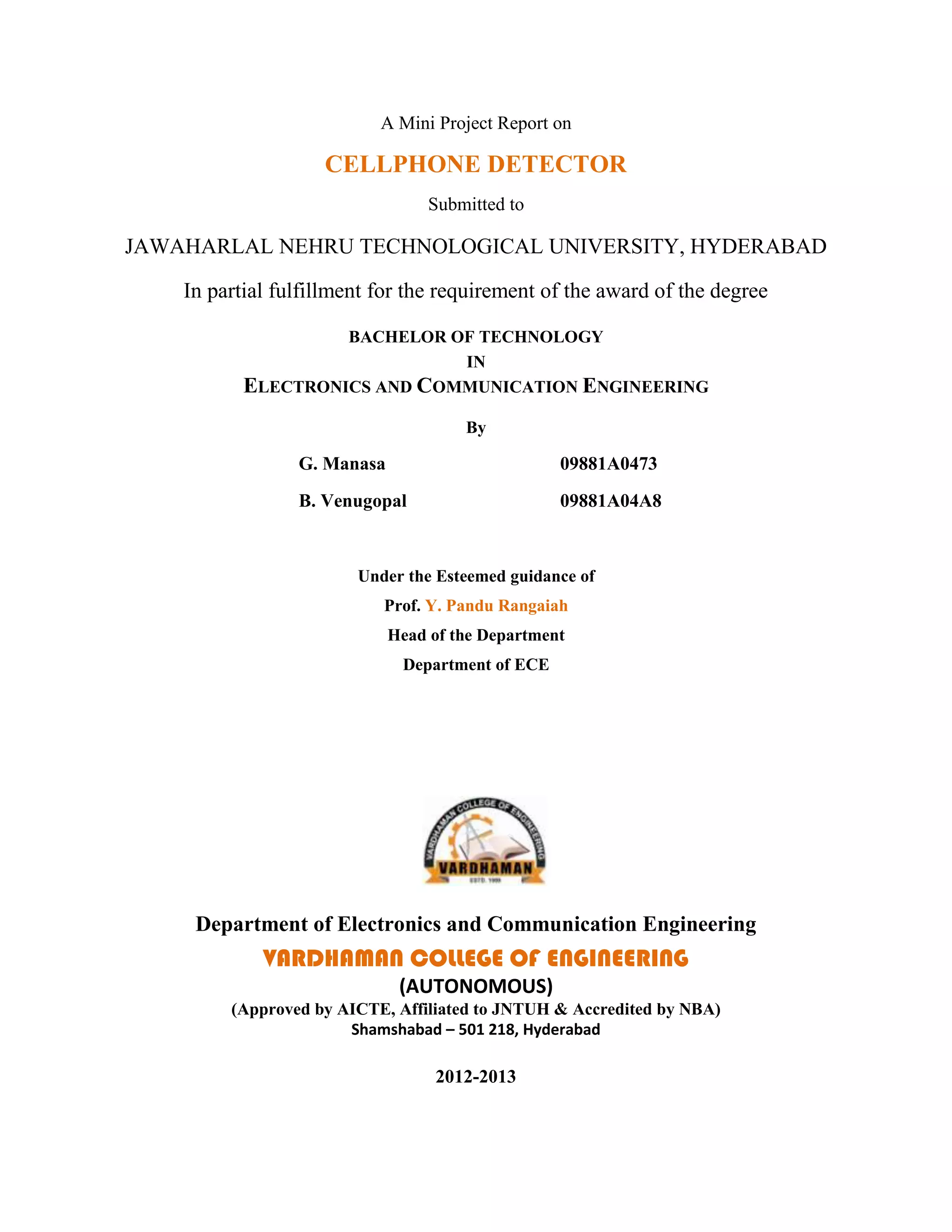 The document is a mini project report on a mobile transmission detector, designed to sense the presence of activated mobile phones within a range of 1.5 meters, primarily to prevent their usage in sensitive areas such as examination halls. Authored by students G. Manasa and B. Venugopal under the guidance of Prof. Y. Pandu Rangaiah, the report details the hardware components, circuit design, and operational principles of the cellphone detector device. Its application includes detecting phone usage for unauthorized purposes, providing alerts through alarms and indicators when transmission is detected.