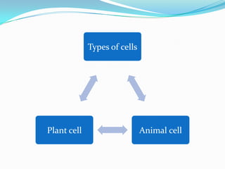 Cells are the fundamental unit of life. Robert Hooke first observed cells in 1665 while examining cork under a microscope. He saw the cork resembled a honeycomb consisting of boxes, which he called cells. There are two main types of cells - prokaryotic and eukaryotic. Prokaryotic cells are smaller and lack a nucleus and membrane-bound organelles, while eukaryotic cells are larger with a nucleus and organelles. The cell theory proposed that all organisms are composed of cells, cells are the basic units of structure and function, and new cells are produced from existing cells. Key components of plant and animal cells include a nucleus, plasma membrane, cytoplasm, and ribosomes, while plant cells