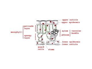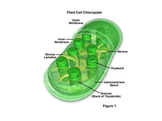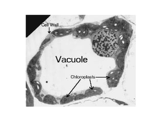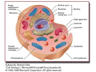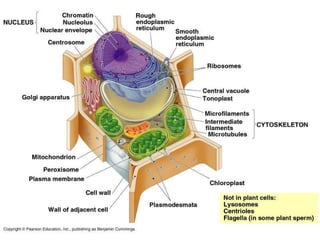 The document summarizes key organelles and structures found within plant and animal cells. It describes the nucleus, mitochondria, endoplasmic reticulum, Golgi complex, ribosomes, plasma membrane, vesicles, lysosomes, centrosomes, chloroplasts, cell wall, vacuoles, and differences between prokaryotic and eukaryotic cells. It also discusses epithelial tissues, mesophyll tissue, and parenchyma cells.