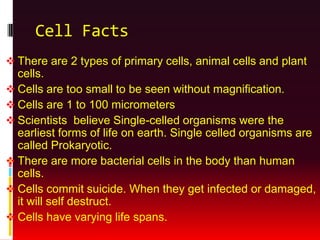 There are two primary types of cells: animal and plant cells. Cells are microscopic structures that were the earliest forms of life on Earth. Cells have various internal parts that allow them to carry out functions necessary for life. Animal cells lack a cell wall and chloroplasts that plant cells have.