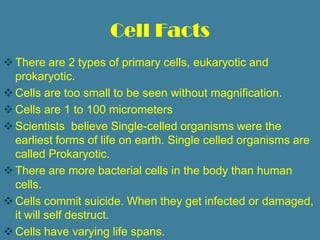 There are two main types of cells: eukaryotic and prokaryotic. Cells are microscopic structures that are the basic unit of life. Animal cells contain organelles like the nucleus, mitochondria, endoplasmic reticulum, and Golgi apparatus. Plant cells also contain these organelles as well as additional structures like chloroplasts, cell walls, and vacuoles for storage. Both animal and plant cells have semipermeable membranes that regulate what enters and exits the cell and internal components that perform specific functions to keep the cell alive.