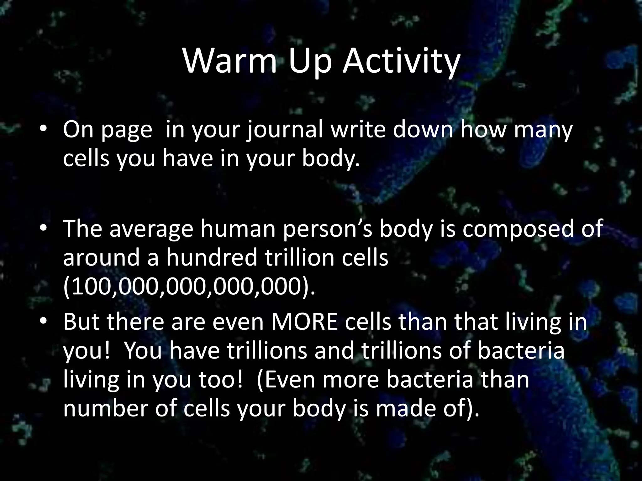 The document discusses cells and their structures. It notes that the average human contains around 100 trillion cells and even more bacteria. All living things are composed of cells, with some made of single cells and others like humans made of trillions of cells. There are two main types of cells - prokaryotes and eukaryotes. While they both have DNA and cell membranes, prokaryotes are smaller and lack membrane-bound organelles, while eukaryotes have larger sizes and structures like the nucleus enclosed in membranes. Students then make models of prokaryotic cells and compare them to images of eukaryotic cells.