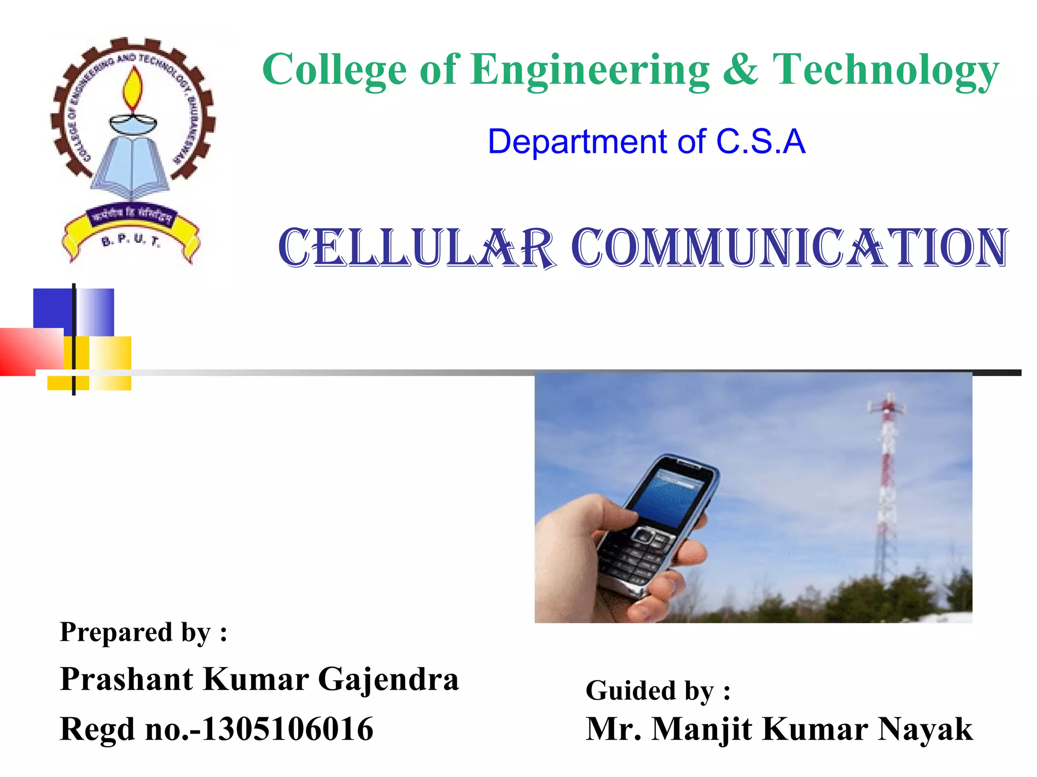 Cellular communication systems have evolved through multiple generations from analog 1G to digital 4G systems. A cellular network is divided into geographical areas called cells served by base transceiver stations. Cells are grouped into clusters where frequencies are reused to allow for more subscribers. When making a call, the cellular phone registers with the local base station which routes the call through switching centers to establish communication with the intended recipient. Modern cellular networks support additional services beyond voice like texting, internet access, and location tracking through technologies like GSM that employ protocols like TDMA for efficient frequency usage.