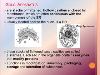 - The Golgi apparatus stacks flattened sacs that modify and package proteins and lipids for secretion or transport within the cell. Lysosomes contain digestive enzymes and help break down materials through autophagy and phagocytosis.