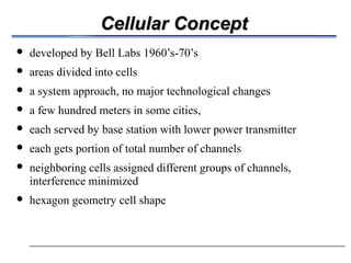 The document discusses the cellular concept and frequency reuse in cellular networks. It describes how: