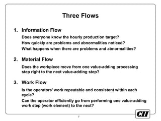 This document provides information on cellular manufacturing and designing cells. It discusses the three flows in manufacturing: information, material, and work flow. It defines cellular manufacturing and lists its benefits. The document outlines the problem with conventional layouts and provides guidelines for identifying product families and determining takt time. It presents the steps to plan cellular manufacturing, including process analysis and razing. Finally, it provides guidelines for cellular layout and questions to consider when designing cells to ensure optimized one-piece flow and continuous improvement.