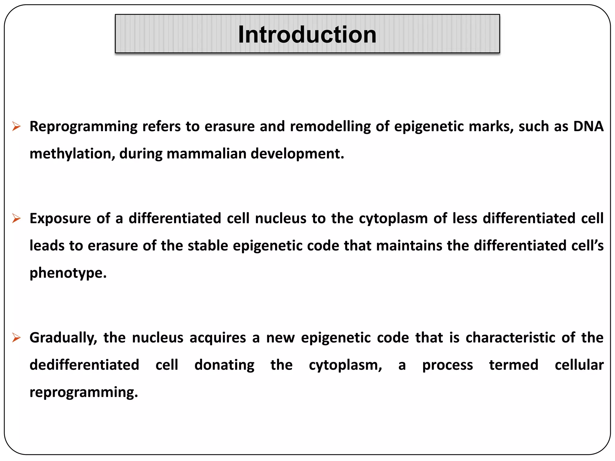 The document discusses cellular reprogramming and the generation of induced pluripotent stem cells (iPSCs), highlighting the process of erasing differentiated cell epigenetic marks and the key factors involved, such as Oct4, Sox2, Klf4, and c-Myc, also known as the Yamanaka factors. It outlines strategies for reprogramming, including viral and non-viral methods, and the roles of microRNAs in enhancing reprogramming efficiency. Additionally, it details the mechanisms of DNA demethylation, the significance of transcriptional networks in maintaining pluripotency, and the importance of chromatin remodeling in the induction of iPSCs from somatic cells.