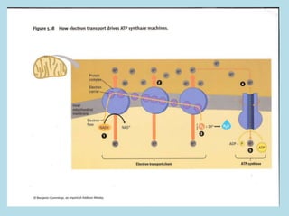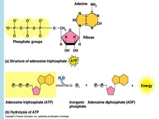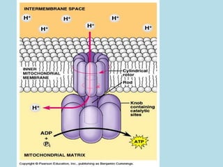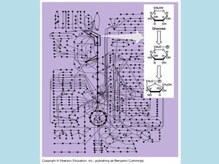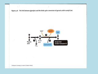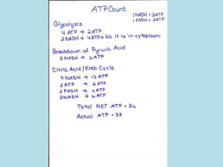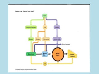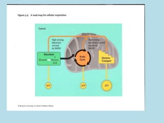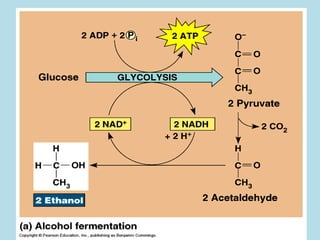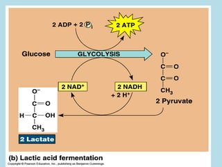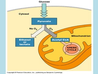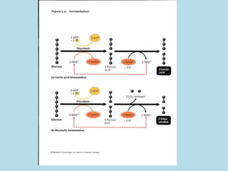 Metabolism involves the chemical processes that take place in organisms. There are two main types of metabolic pathways - catabolic pathways that break down molecules and release energy, and anabolic pathways that use energy to build molecules. Cellular respiration uses catabolic pathways to break down glucose and other food molecules, releasing energy that is captured in ATP. There are four main stages of cellular respiration: glycolysis, pyruvate oxidation, the citric acid cycle, and the electron transport chain. When oxygen is absent, cells carry out anaerobic respiration like lactic acid fermentation or alcoholic fermentation to regenerate NAD+ and allow glycolysis to continue producing a small amount of ATP.