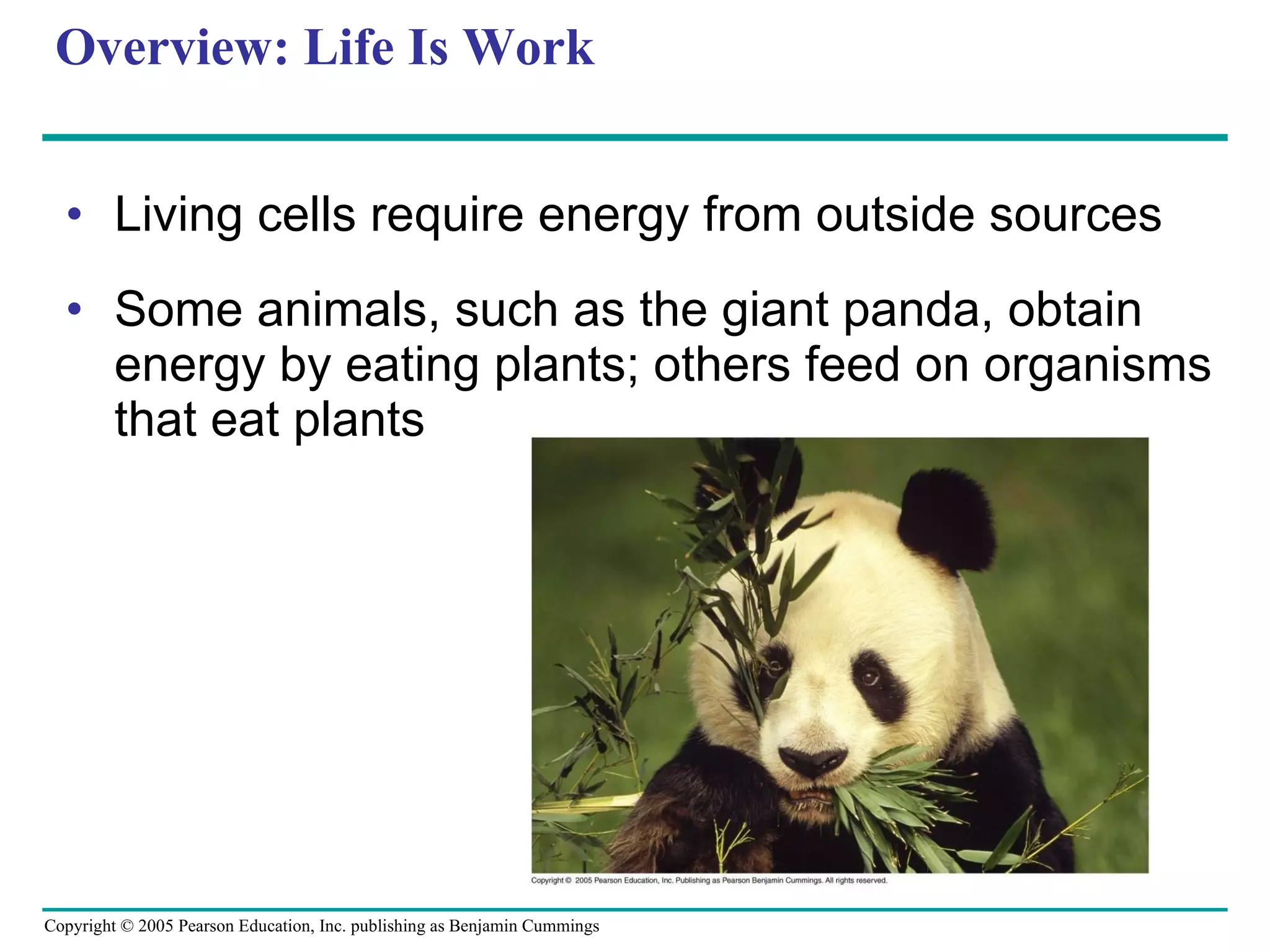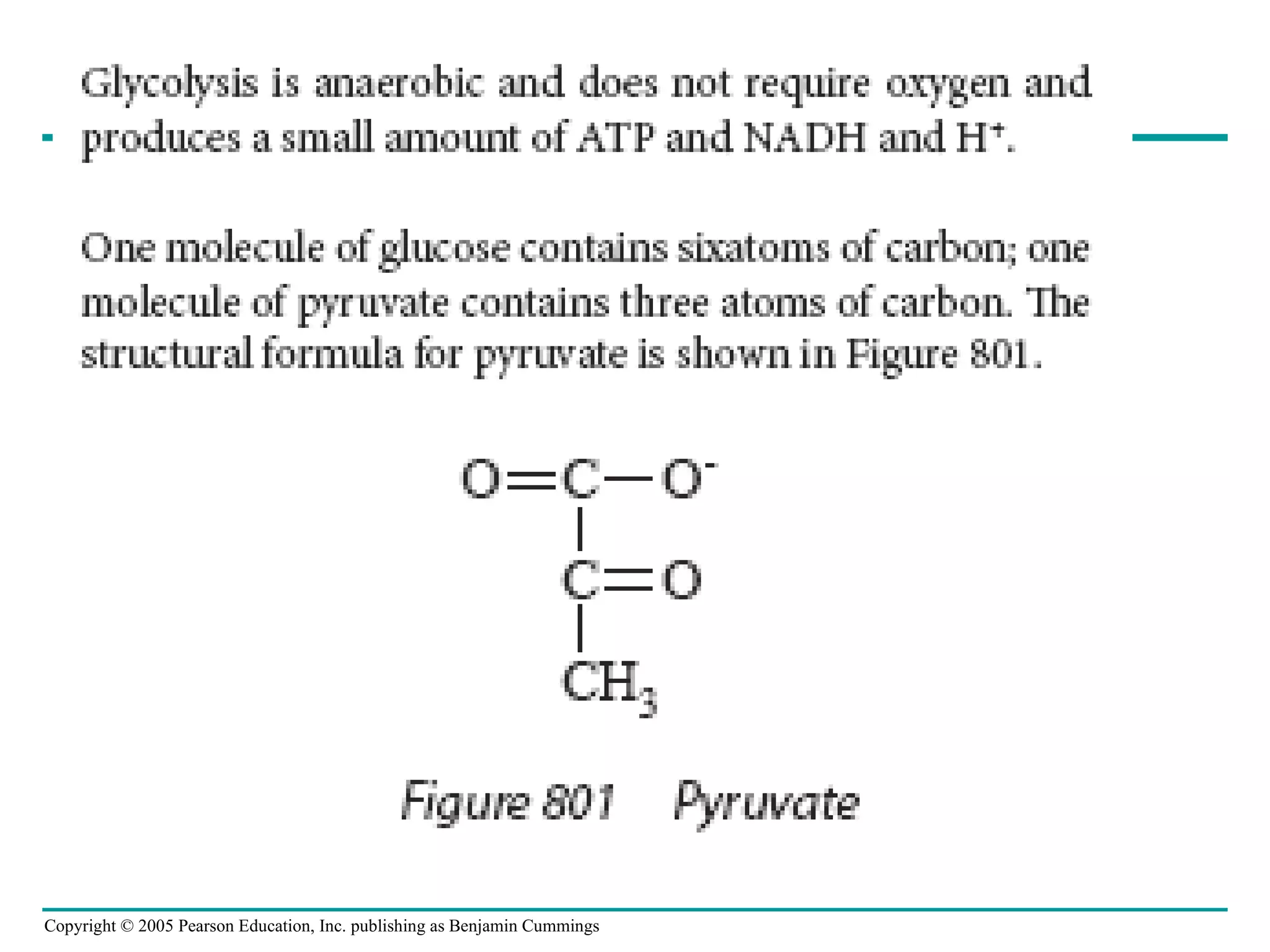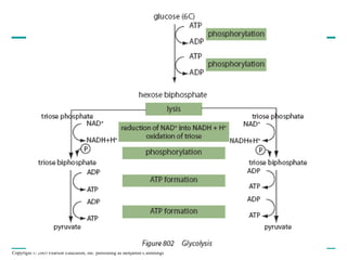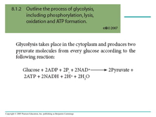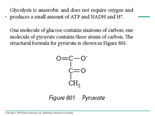 The document summarizes cellular respiration, which consists of three main stages: glycolysis, the citric acid cycle, and oxidative phosphorylation. Glycolysis breaks down glucose into pyruvate and generates a small amount of ATP. The citric acid cycle further oxidizes pyruvate and generates more ATP, NADH, and FADH2. During oxidative phosphorylation, electrons from NADH and FADH2 are passed through an electron transport chain where their energy is used to pump protons across a membrane and generate a proton gradient. ATP synthase uses this proton gradient to generate most of the cell's ATP through chemiosmosis.