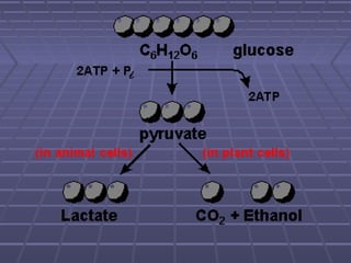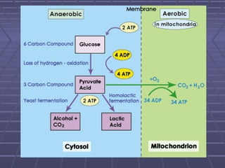 Cellular respiration is the process by which cells convert glucose into usable energy (ATP). There are two types of cellular respiration: aerobic respiration, which uses oxygen to produce 36 ATP, and anaerobic respiration, which does not use oxygen and produces only 2 net ATP. The process begins with glycolysis in the cytoplasm, which breaks glucose into two pyruvic acid molecules. The cell then undergoes either anaerobic respiration through fermentation, or aerobic respiration in the mitochondria.