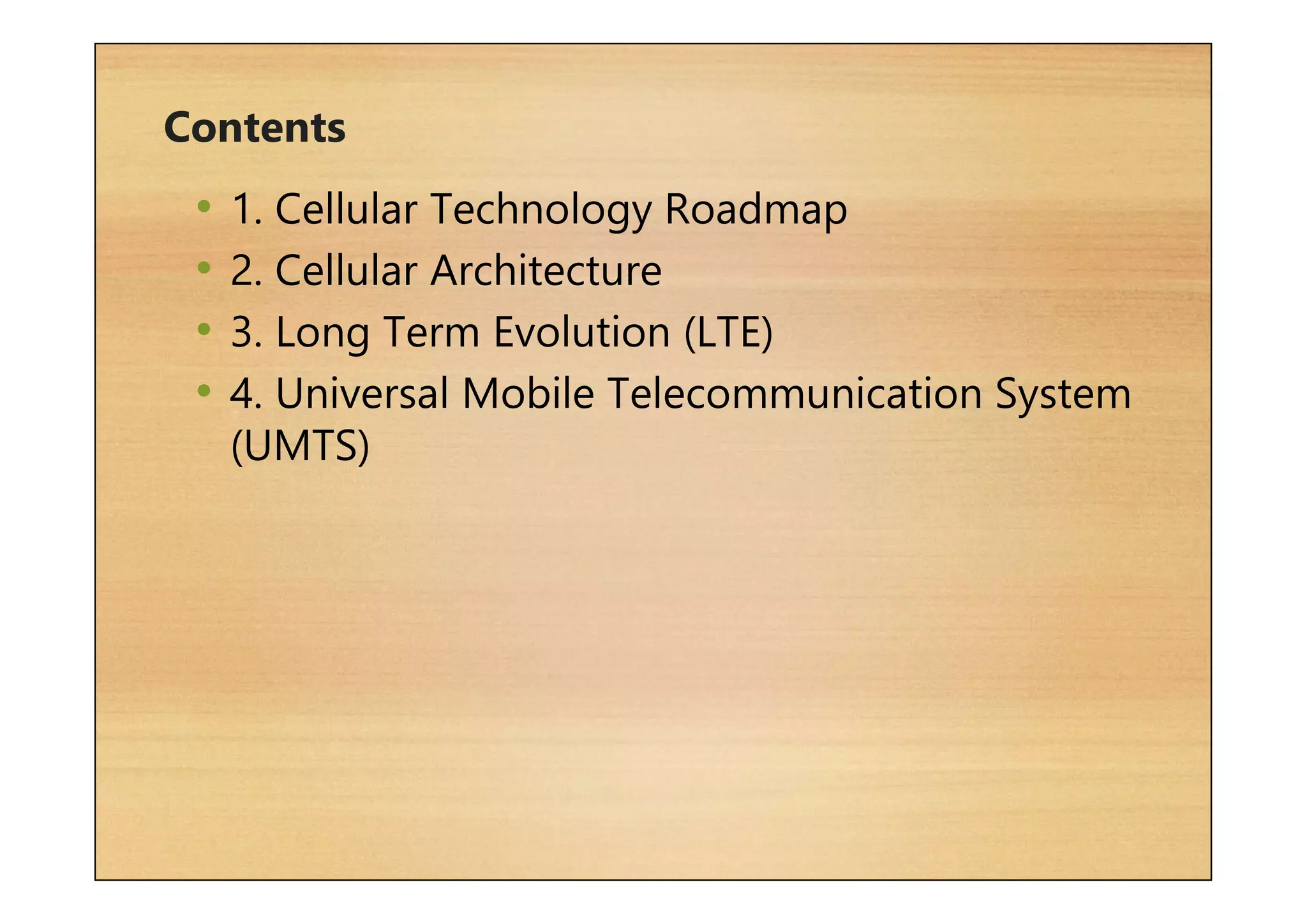 This document provides an overview of cellular technology roadmaps and standards including LTE and UMTS. It summarizes the evolution of technologies like W-CDMA, HSPA, HSPA+ and LTE over time with increasing download/upload speeds. It describes the key aspects of LTE including OFDMA, SC-FDMA, MIMO and LTE-Advanced. It also provides an overview of UMTS architecture and air interface standards like W-CDMA, HSDPA and HSUPA.