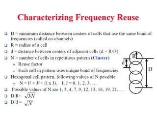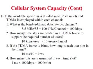 2) Cellular networks operate by dividing geographic areas into cells served by base stations, with frequency reuse allowing the same radio frequencies to be used in distant cells. As users move between cells, the network performs handoffs between base stations to maintain connectivity.