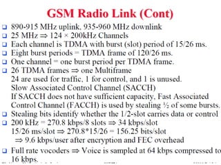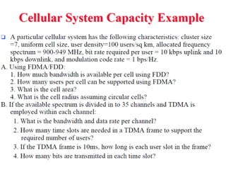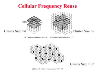 2) Key technologies enabling multiple access of many users over cellular networks include FDMA for 1G, TDMA for 2G and 3G, and CDMA for 2G and 3G. Cell sites are organized into a cellular structure with frequency reuse to improve capacity. Handoffs allow user mobility between cell sites.