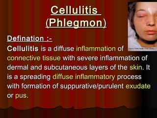 1. The document discusses cellulitis, a bacterial skin infection causing inflammation. It defines cellulitis and describes its symptoms such as red, swollen, tender skin.