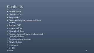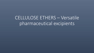 Cellulose ethers are versatile pharmaceutical excipients derived from cellulose. They include sodium carboxymethylcellulose (SCMC), hydroxypropyl methylcellulose (HPMC), methylcellulose, croscarmellose sodium, and ethylcellulose. SCMC is widely used as a coating agent, stabilizing agent, and suspending agent. HPMC is used as a bioadhesive, coating agent, and release-modifying agent. Methylcellulose and croscarmellose sodium are commonly used as disintegrants. Ethylcellulose is employed as a coating agent and release modifier. These cellulose derivatives find applications in oral, topical and other dosage forms due to their safety and functionality.