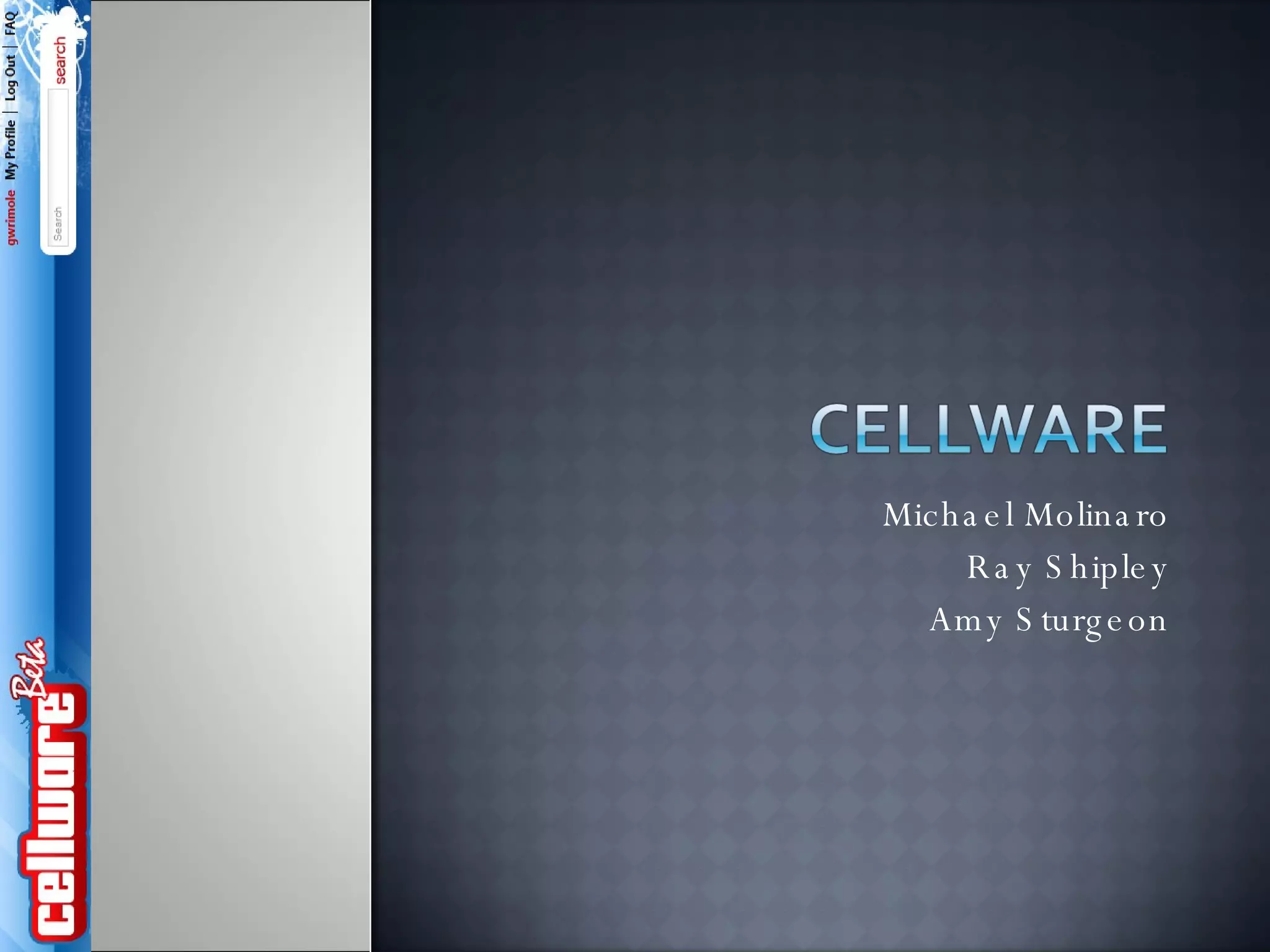 Cellware was founded in 2007 as the first mobile social networking site, allowing users to design, create, customize and share ringtones, wallpapers, videos and games for free. Users can build a profile, invite friends, browse and download content, earn credits to exchange for cash, and communicate with other Cellware users. Cellware integrates with sites like Facebook to bring people and ideas together through social networking and content sharing across multiple platforms.