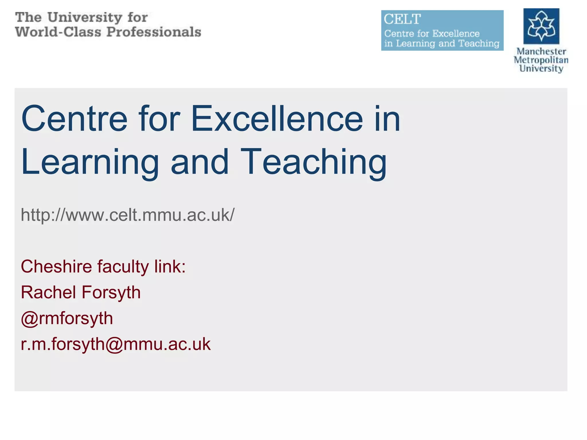 The Centre for Excellence in Learning and Teaching (CELT) at Manchester Metropolitan University provides support for teaching staff. It develops the university's learning, teaching and assessment strategy in six areas. CELT supports staff through strategic policy development, interventions and evaluations. It offers professional development courses and certificates in academic practice tailored to experience levels. Key resources and upcoming events are also listed.