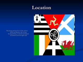 The document discusses various aspects of Celtic culture, including their origins in ancient Greece, artistic traditions featuring spirals and animals, farming practices of growing grains, raising of livestock like cattle, and use of musical instruments such as flutes and bagpipes.