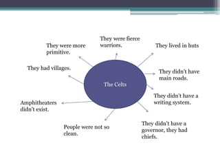 The Celts lived in primitive conditions without major infrastructure like roads or a writing system, instead living in villages led by chieftains. In contrast, the Romans had advanced infrastructure including main roads and a disciplined army, lived in houses, and were generally cleaner and healthier, with amenities like central heating and amphitheaters. Hadrian's Wall was built by the Romans along the border of England to keep out Scottish tribes that the Romans could not defeat.