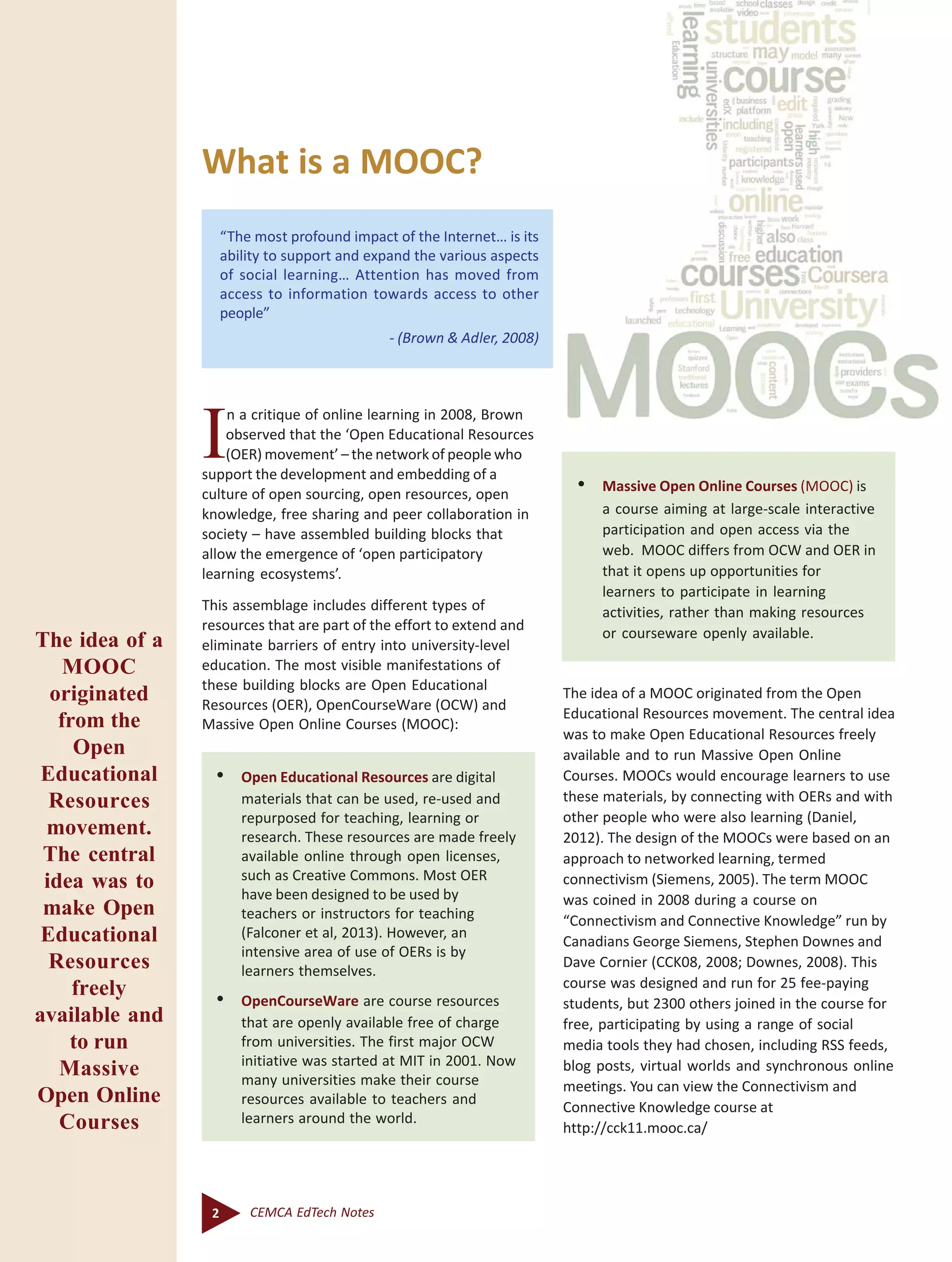 The document discusses Massive Open Online Courses (MOOCs). It defines MOOCs and explains their origins in the Open Educational Resources movement. There are two main types of MOOCs - cMOOCs which follow a connectivist pedagogy and xMOOCs which follow an instructivist model. xMOOCs are more common and make up the majority of current MOOCs. The document also summarizes research on how learners experience MOOCs and how they learn in open online environments through connecting to knowledge resources, other learners, and contributing new knowledge.