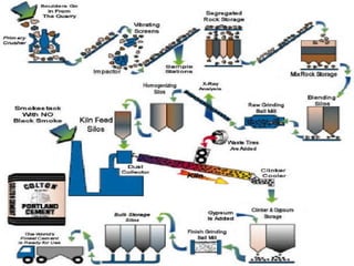 Cement is a binder that sets and hardens, binding other materials together. There are two main types: hydraulic cement, which sets in the presence of water, and non-hydraulic cement, which requires dry conditions to set. Portland cement is the most common type of hydraulic cement, produced by heating limestone, clay, and other materials in a kiln to form clinker, which is then ground with gypsum. The clinker is composed mainly of calcium silicates, aluminates, and aluminoferrites which give Portland cement its strength and properties.