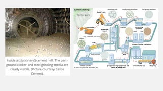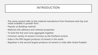The document provides an overview of cement, highlighting its composition, manufacturing processes, types, and applications, emphasizing Portland cement as the most common variety. It details hydration, setting stages, and quality tests for cement, along with a description of various types such as acid-resistant, blast furnace, and white cement, among others. Additionally, it outlines the numerous functions of cement in construction and describes essential properties that characterize good-quality cement.