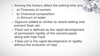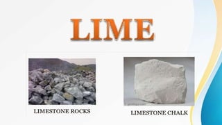 The document presents information on cement and lime in civil engineering, detailing tests such as compressive and tensile strength, and various types of cement production processes. Additionally, it discusses the multiple applications of lime, including pollution control, construction, water treatment, and agriculture. The different types of lime kilns and their uses are also covered.