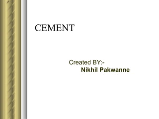 This document discusses cement, including its composition, manufacturing process, types, storage, field and laboratory tests. Cement is produced by burning and crushing limestone and clay. The main steps are mixing raw materials, burning at high temperatures, and grinding the resulting clinker along with gypsum. Common cement types include ordinary Portland cement, Portland pozzolana cement, and colored cement. Proper storage and testing ensures the quality and performance of cement.