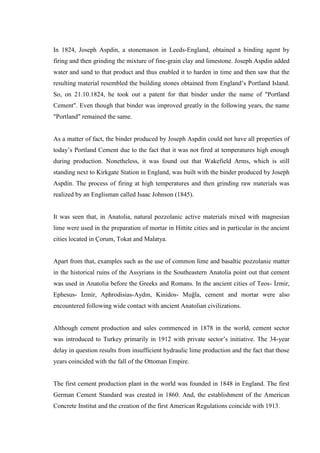 This document provides a history and overview of cement production. It discusses the origins of cement dating back to ancient civilizations using lime as a binding agent. Modern cement originated in the 18th-19th centuries as individuals experimented with combinations of limestone and other materials. The first commercial cement plant opened in England in 1848. Cement production began in Turkey in 1912 with two initial plants. The document then focuses on Göltaş Göller Bölgesi Çimento Sanayi ve Ticaret Anonim Şirketi, the first private cement factory in Turkey, which opened in 1969 and details its production facilities, products, and manufacturing process.