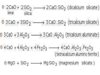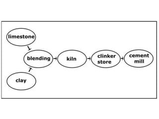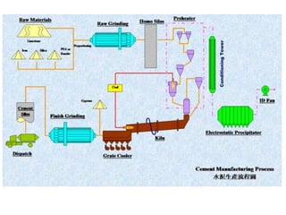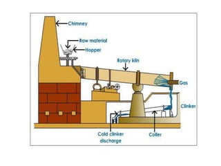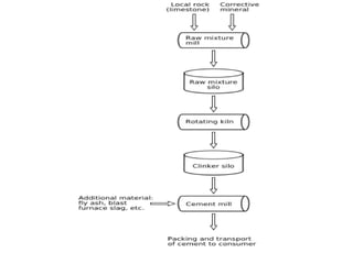 Cement is a finely ground mineral powder, primarily made from limestone and clay, that acts as a binding agent when mixed with water, sand, and gravel to create concrete. The manufacturing process involves heating raw materials in a kiln to produce clinker, which is then ground with gypsum to form ordinary Portland cement. Various types of blended cements incorporate supplementary materials like fly ash or slag to enhance properties such as strength, setting time, and heat resistance.