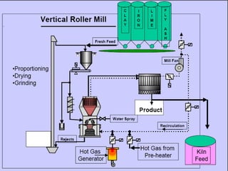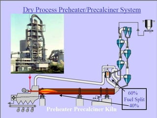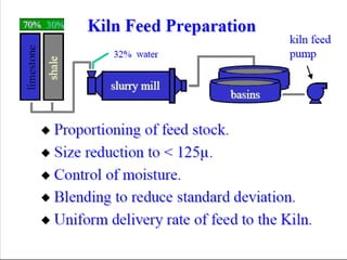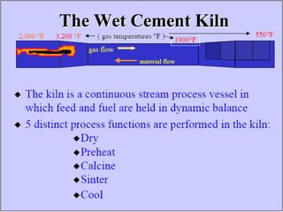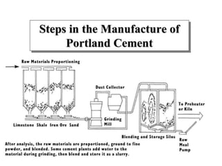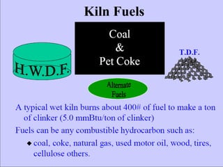 This document discusses Portland cement and the cement manufacturing process. It begins with an overview of what cement is and how it is used to make concrete. It then describes the industrial process for manufacturing cement, involving grinding raw materials like limestone and clay at high temperatures in a kiln to form clinker, which is then pulverized with gypsum to become Portland cement powder. The document also provides a brief history of cement development and explains how cement kilns can beneficially reuse solid and hazardous wastes as a source of energy and raw material replacement due to the kilns' high temperatures and long retention times.