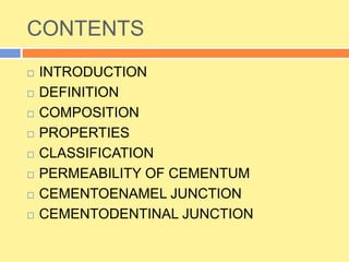 This document provides an overview of cementum, including its definition, composition, properties, classification, and clinical considerations. Some key points: