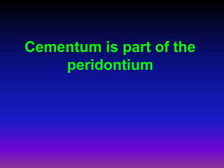 The document discusses the peridontium and its components, which include the gingiva, periodontal ligament, cementum, and alveolar bone. It focuses on cementum, describing it as a hard connective tissue that covers tooth roots and provides attachment for collagen fibers. Cementum begins forming at the cementoenamel junction and continues to the root apex. It contains cementoblasts and cementocytes that aid in its formation and structure. Cementum comes in cellular and acellular varieties and demonstrates incremental lines from its continuous deposition over time.