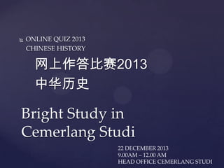 Cemerlang Studi Tuition Centre将于2013年12月22日上午9点至中午12点举行一场有关中国历史的在线测验,包含40道问题,参与者需回答所有问题,涉及明朝皇帝、历史事件等多个主题。