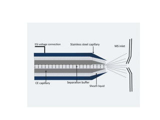 CE-MS is an analytical technique that combines capillary electrophoresis (CE) and mass spectrometry (MS). CE separates ions based on their charge and size, while MS identifies molecules based on their mass-to-charge ratio. CE-MS provides high separation efficiency, molecular mass information, and can analyze small sample volumes at high speeds. It has applications in proteomics, biomolecule analysis, and clinical medicine. Challenges include developing interfaces between CE and MS that maintain separation efficiency and sensitivity.