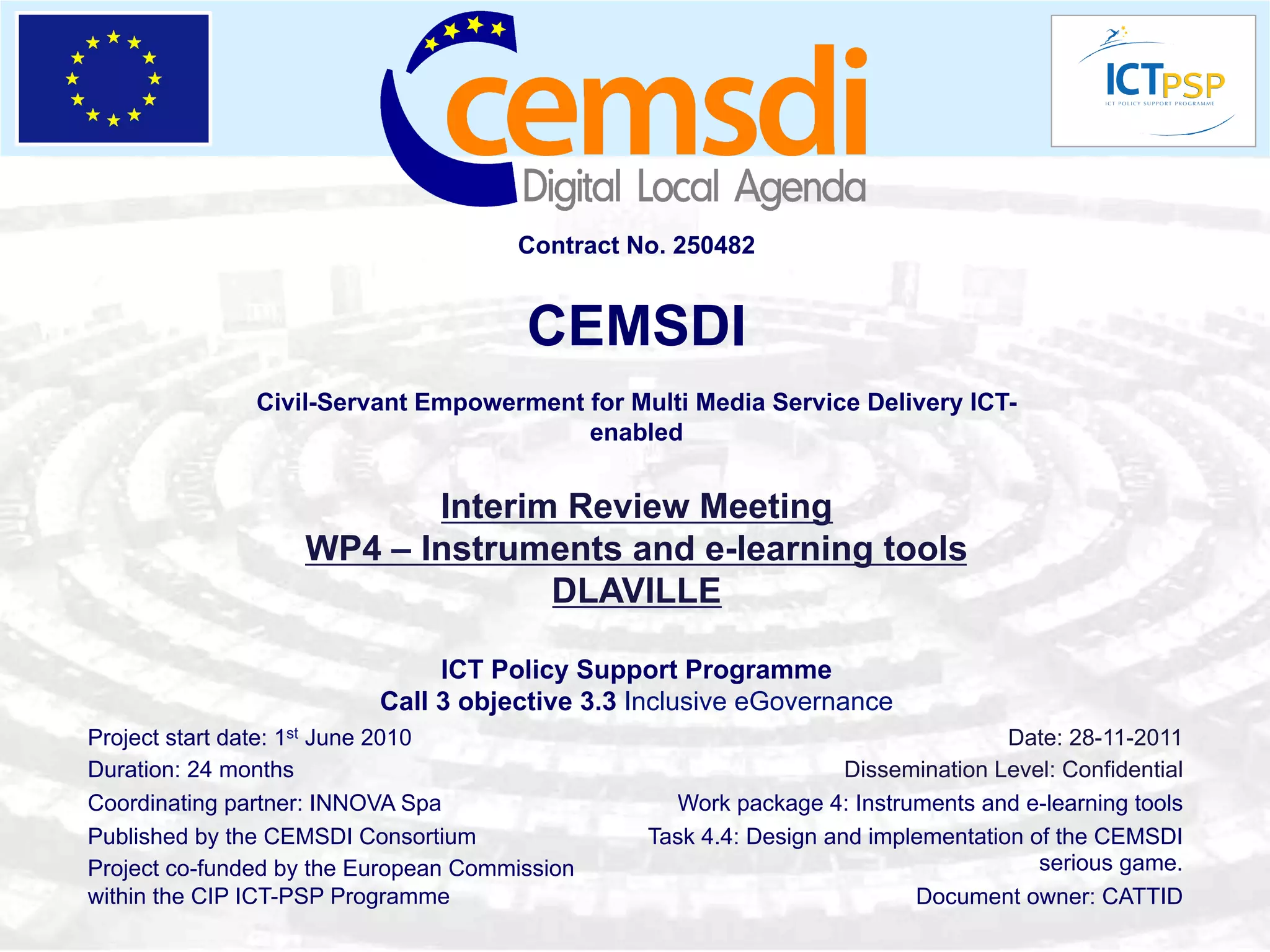 The document outlines the CEMSDI serious game called DLAVille, which aims to educate policy makers and public administration practitioners about digital literacy action plans through a simulation game. It discusses why serious gaming is an effective educational approach, providing active participation, hands-on problem solving and continuous feedback. DLAVille simulates managing a city to increase citizen welfare by achieving objectives in a library, classroom and office. Open source tools like Blender and jQuery are used to develop the 3D environment and interface. The game has evolved based on feedback from consortium meetings.