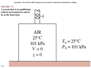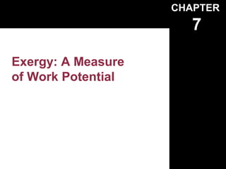 This document contains 20 figures from Chapter 7 describing concepts related to exergy, a measure of work potential. Exergy is defined as the useful work possible during a reversible process bringing a system to equilibrium with its environment. The figures address topics like the dead state, work potential of temperature gradients, reversible versus irreversible work, exergy transfers through heat, work and mass flows, and exergy balances for systems. Irreversibility and exergy destruction are also discussed.